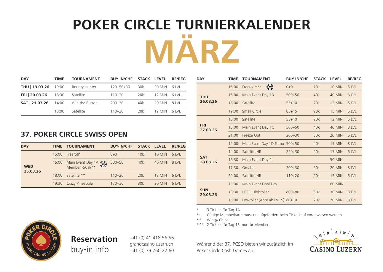 37. PCSO im Grand Casino Luzern vom 25. bis 29. März und Eröffnung der Poker Circle Swiss Masters (PCSM)