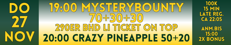 19:00 Uhr das Monday 100er Main ohne Ante. Gewinner erhält ein 340er Luzern Ticket on top.