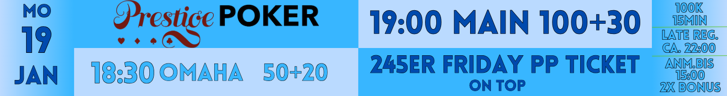 19:00 Uhr das Monday 100er Main ohne Ante. Ein 245er Friday Freezeout PP Ticket on Top.