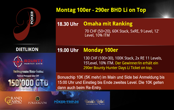 19:00 Uhr das Monday 100er Main ohne Ante. Gewinner erhält ein 290er Bounty Hunter Days Liechtenstein Ticket on top.