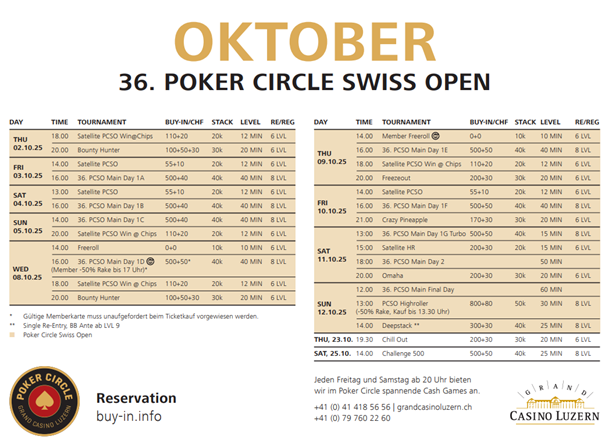 Zum 36. Mal findet die Poker Circle Swiss Open statt. Und zwar vom 02.-12. Oktober 2025.