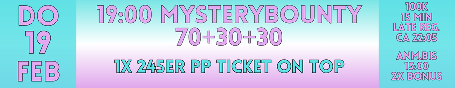 Bei 25% der Entries gibt`s Bountykarten für einen Seat Open. Mit dieser darf er ein Couvert aus der Mystery Kiste ziehen. 1x245er PP Freezeout Ticket on Top.