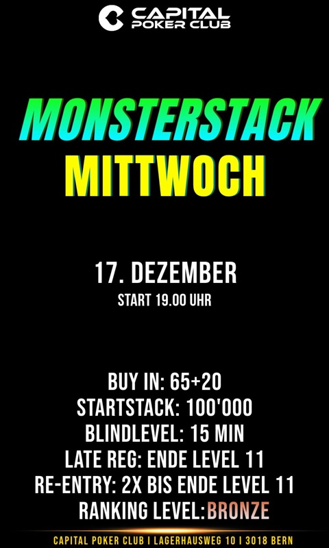 19:00 Uhr das Monday 100er Main ohne Ante. Gewinner erhält ein 290er Bounty Hunter Days Liechtenstein Ticket on top.