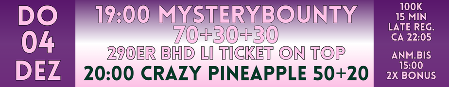 Um 19:00 Uhr Das Monthly 100er Omaha. Bounty auf Michi Zijan, ein 200er Omaha Ticket in Luzern, am 20. Dezember.