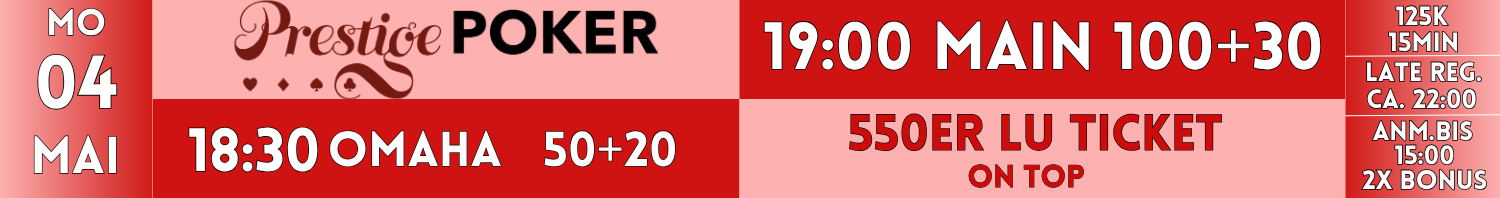 19:00 Uhr das 125K Extra Stack Monday ohne Ante. Gewinner erhält ein 340er Luzern Spring Special Ticket on top.