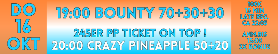 19:00 Uhr startet das Donnerstag 100er Bounty. (70+30+30).