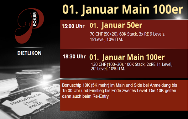 Bei Anmeldung im Main 4h vor Start und Einstieg bis Ende 2. Level im Main 10K Bonus (auch bei Re-Entry).