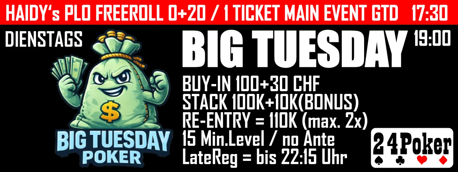 | Di 03.03. | 24-Big Tuesday Poker 130er | CHF 100+30 | |