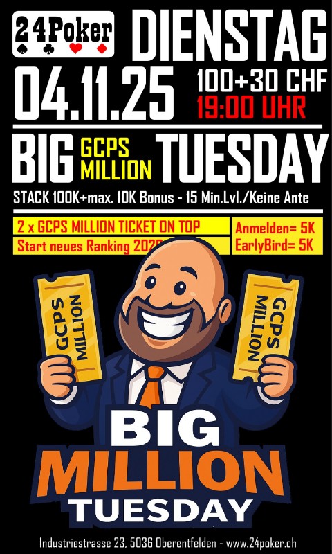 19:00 Uhr das Monday 100er Main ohne Ante. Gewinner erhält ein 1100er GCPS Ticket on top.