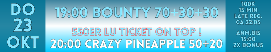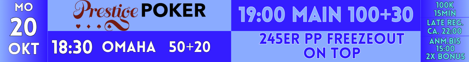 19:00 Uhr das Monday 100er Main ohne Ante. Ein 245er Friday Freezeout PP Ticket on Top.